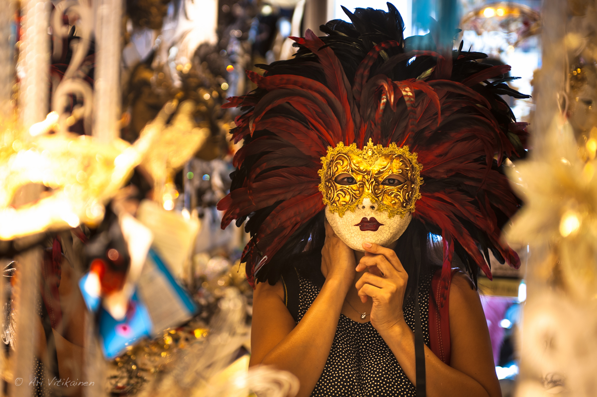 I did consider buying a genuine Venetian mask. But it’s very costly and after all, I’m not going to any Venetian carnival. Masks have always been the main feature of the Venetian carnival. They can be made of leather, porcelain or with the original glass technique. The original masks were simple in design with symbolic functions. Nowadays, most of Venetian masks are made with the application of gesso and gold leaf and are hand-painted using gems and natural feathers. The use of masks in Venice can be traced back as far as the 13th century. But in the past, these masks were also associated with rebellion. They can be a cover and a disguise when committing forbidden acts. There was a time when the wearing of masks in normal daily life was severely restricted. The mask I was trying here cost 150 Euros.
